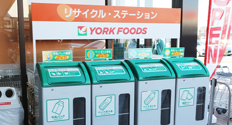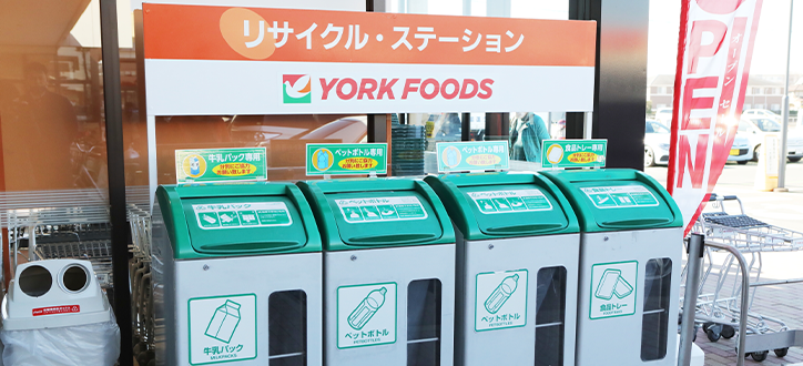 各店店舗に資源回収ボックスを設置し、お客様のご協力をいただき、2024年の年間回収量は牛乳パック約502t、食品トレー約144t、ペットボトル約488tにおよび、これらは全てリサイクルされています。商品納入のために使用されている段ボール類約37881.1t、発泡スチロール約900.5tも全量がリサイクルされています。生鮮(精肉・青果・鮮魚)、惣菜の各売場では、容器の減容化や、バラ売り、1個売りなどの販売方法を積極的に展開しています。この販売方法は包材資材の使用量が減るため、環境負荷の削減につながっています。