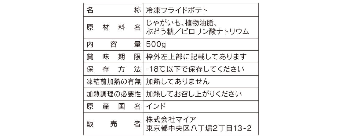 - ホクッとしたじゃがいも本来の豊かな食感が特徴のインド産の原料を使用