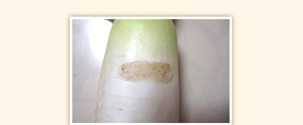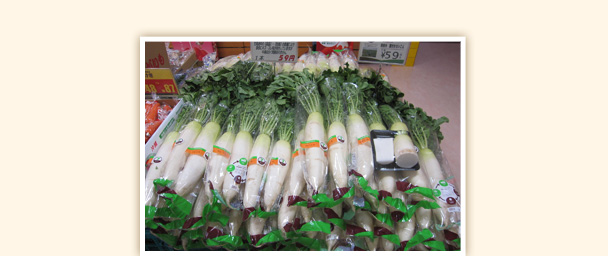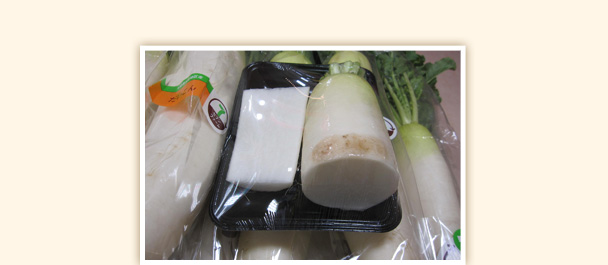だいこんの圃場の一部にて病害発生。通常、市場流通では廃棄処分となるがセブンファーム直営農場では輸送費などのコストを計算して最低限の手取りが残るように価格設定してお店にて販売を行っています。