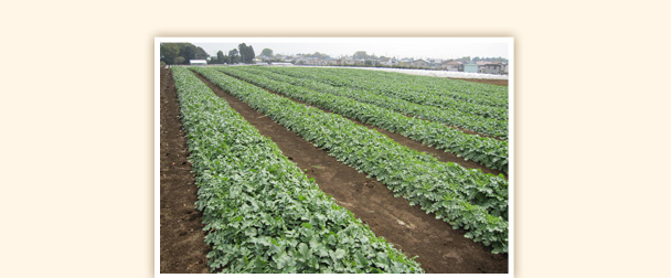 収穫前の圃場です。葉っぱが青々とみずみずしく育ちました。