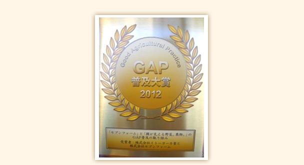 セブンファームの農場がGAPへの取り組みを推進することで、近隣生産者のGAPへの関心や意欲を高めろことにも貢献しています。2012年にはイトーヨーカドーの「セブンファーム」の取組みが評価されGAP普及大賞を受賞。
