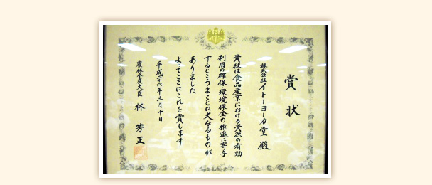 株式会社イトーヨーカ堂は、このたび、一般財団法人食品産業センターおよび公益財団法人食品流通構造改善促進機構主催(後援:農林水産省)「平成25年度第35回食品産業優良企業等表彰」環境部門にて、農林水産大臣賞を受賞いたしました。このたびの当社の受賞は、環境部門〈食品リサイクル推進タイプ〉環境循環型農業『セブンファーム』の取組みとなります。