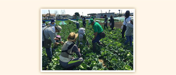 天候にも恵まれた当日はセブンファーム三浦の生産者鈴木様の畑で大きく育ったきゃべつを収穫。