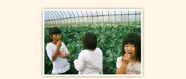 スティックセニョールの収穫体験。採れたてなので生で食べても美味しくてびっくり。