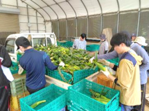自分達で収穫した朝採りとうもろこしを自分達の手で並べ、お客さんに紹介します。