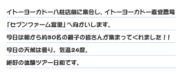 今回は、いつもイトーヨーカドーに来ていただいている皆さんに、「セブンファーム富里」での工場見学・農業実習など、楽しい体験を通して、「セブンファーム富里」を設立した目的や、「安全・安心や環境への取り組み」の大切さを知っていただきたいと思っています。