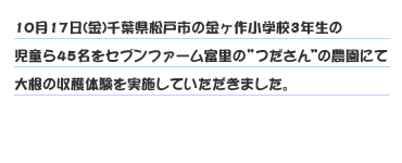 今回、体験ツアーに参加してもらった金ヶ作小学校は 毎年学校の裏の畑で野菜を育てたり各学年の児童達が普段から農業体験に親しんでいる学校だそうです。セブンファームの取組みも理解してもらえると嬉しいです。