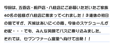 今回も、いつもイトーヨーカドーに来ていただいている皆さんに、「セブンファーム富里」での説明会・農業実習などの体験を通して、「セブンファーム富里」を設立した目的や、イトーヨーカドーの「安全・安心や環境への取り組み」の大切さを知っていただきたいと思っています。