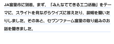 日本と取り巻く環境問題や農業の現状をクイズ形式で学び、セブンファーム富里の取り組みについて知っていただけたと思います。 店舗から出た生ゴミを堆肥にして利用する完全循環型農業のリサイクルループの説明にも、興味を持っていただけました。