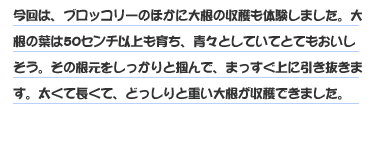 セブンファーム富里では、ブロッコリーや大根のほかに、トウモロコシやじゃが芋、にんじんを作っています。とくに富里は、にんじんの産地として有名な所です。