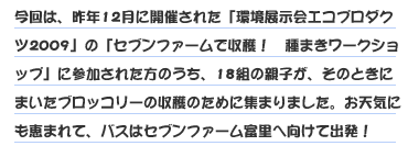 「環境展示会エコプロダクツ2009」に来場された方々に、セブンファームでの収穫体験を通して、「セブンファーム富里」の設立目的や取り組みについて知っていただきたいと思います。種まきと収穫の作業を体験してもらうことで、農業を身近に感じてもらいたいです。