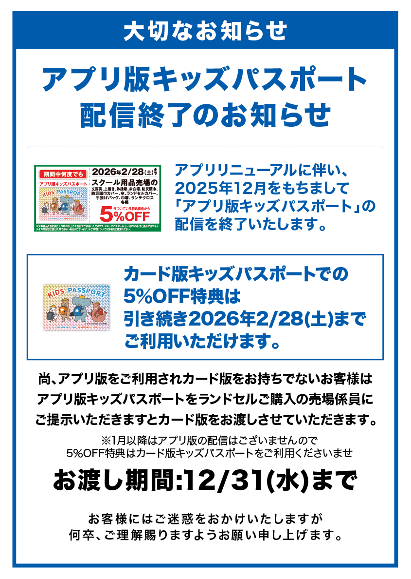※一部取り扱いの無い店舗がございます。 ※一部対象外の商品がございます。 ※本企画の内容は予告なく変更・中止となる場合がございます。 ※キッズパスポートを紛失、破損された場合でも、再発行は致しかねますのでご了承ください。