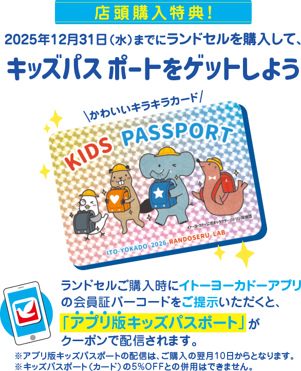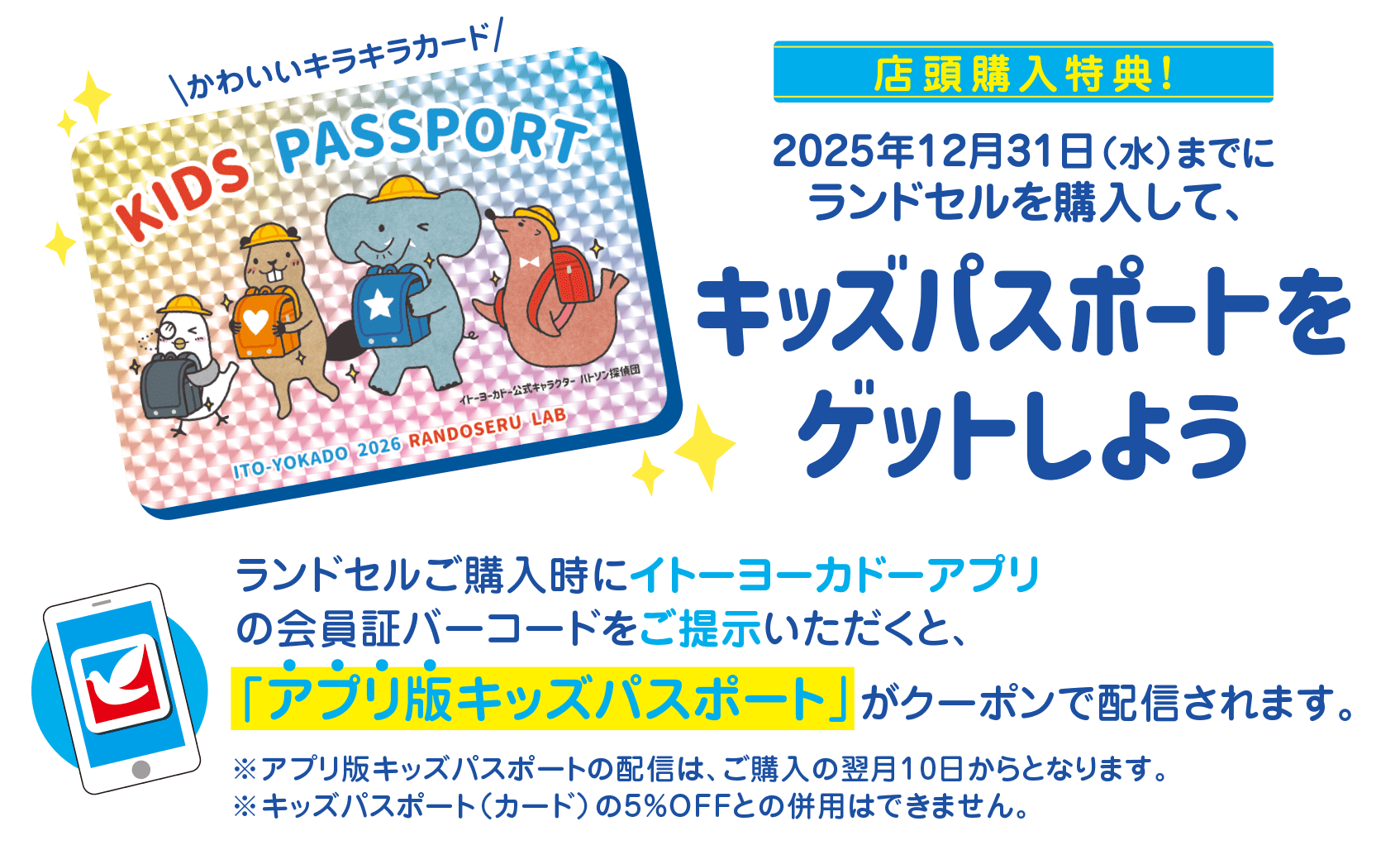 ※イトーヨーカドー店頭で対象商品を含む税込1,000円以上のお会計でご利用いただけます。※お会計時にキッズパスポートのご提示をお願いします。※カード会員様限定の割引時、ハッピーデー・シニアナナコデー5%OFF時は割引後価格より更に割引いたします。※その他の割引企画との併用はできません。※ご利用はご本人様とそのご家族様に限ります。※カートレジ・スマホレジ・セルフレジ・ネット通販・ネットスーパーではご利用いただけません。