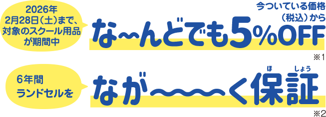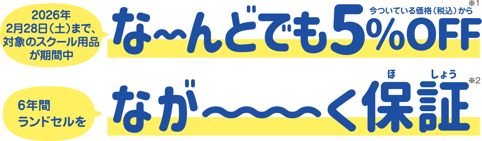 ※2 ※修理の際は「保証書」が必要となります。※「6年間保証」はランドセルをご購入頂いた方全員が対象です。 ※ネット通販では別企画を実施いたします。詳しくはネット通販サイトをご確認ください。